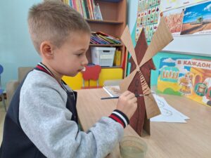 В нашем детском саду проходит тематическая неделя «Хлеб- всему голова», старшие дошкольники выполняли творческую работу » Пшеничный колосок», разукрашивали мельницу из картона (коробки), Играли в дидактическую игру узнай по тени ( хлебобулочные изделия).